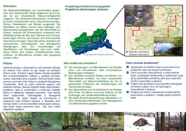 Odolnost krajiny a ekosystémů vůči změně klimatu závisí do značné míry na tom, jak reagují na extrémně kolísající přísun vody. Příhraniční oblast mezi Saskem a Českou republikou je obzvláště postižena environmentálními riziky vyplývajícími z povodní a sucha (časté záplavy, odumírání lesů, lesní požáry). Činnost bobrů může vést k vyrovnání vodní bilance, zvýšení biodiverzity, a tím i ke zvýšení odolnosti regionu vůči klimatickým změnám. Vedle pozitivních účinků (např. renaturalizace vodních toků, zvýšení retence) je třeba brát v úvahu i účinky negativní (např. podemílání, nežádoucí záplavy). Specifickou vlastností bobra je jeho snaha o vytváření příznivého životního prostředí budováním hrází ve vodních tocích. Tím se mění hydraulické, hydrologické a ekologické podmínky jak nad hrázemi, tak pod nimi. Zda a za jakých podmínek jsou tyto změny významné pro regionální poměry povrchových a podzemních vod, není dosud jasné. V důsledku toho nemají místní úřady i vodohospodářské a ekologické orgány k dispozici spolehlivé podklady pro rozhodování a argumentaci, zda mají být bobří hráze na vodním toku ponechány, nebo zda jsou nutná adaptační opatření. Cílem projektu je proto ukázat, do jaké míry mohou bobří hráze pozitivně přispět ke zmírnění a překonání environmentálních rizik způsobených změnou klimatu v příhraničním regionu.